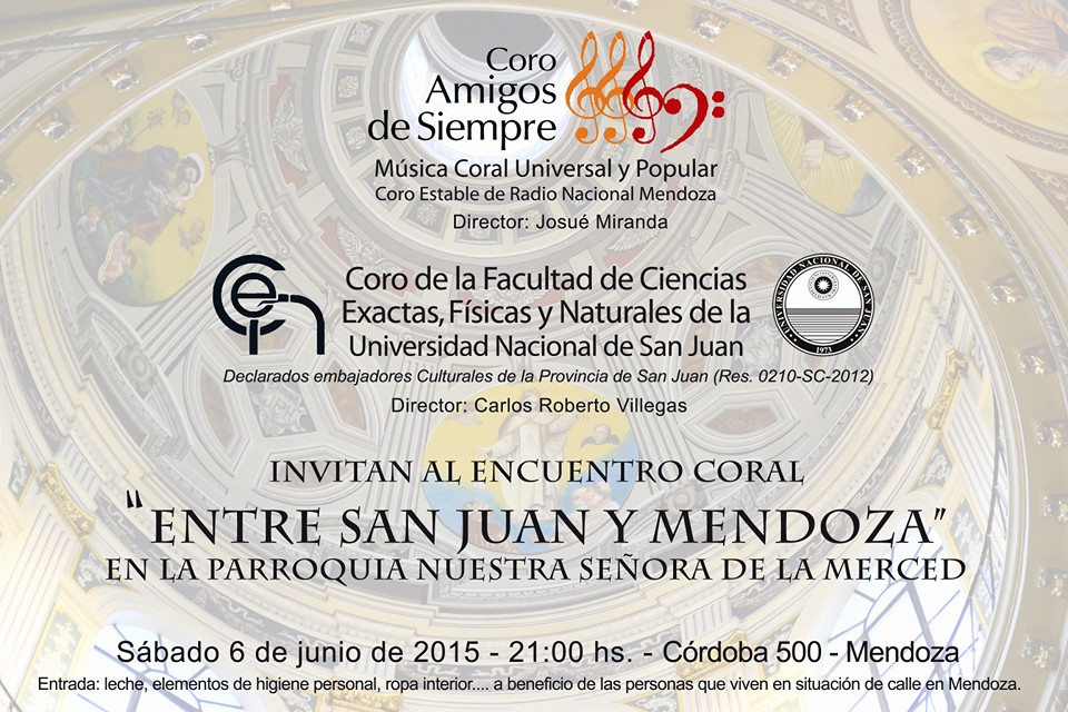 El pasado sábado 6 de junio se realizó en la Ciudad de Mendoza un espectáculo solidario a beneficio de personas en situación de calle. Se trató de “Entre San Juan y Mendoza”, encuentro coral que contó con la participación del Coro Amigos de Siempre (Coro estable de Radio Nacional Mendoza) dirigido por el Mtro. Josué Miranda y el Coro de la Facultad de Ciencias Exactas, Físicas y Naturales dependiente de la Universidad Nacional de San Juan, dirigido por el Lic. Carlos Roberto Villegas, para esta ocasión bajo la batuta del asistente de dirección, Lic. Pablo Andrés Blanc.