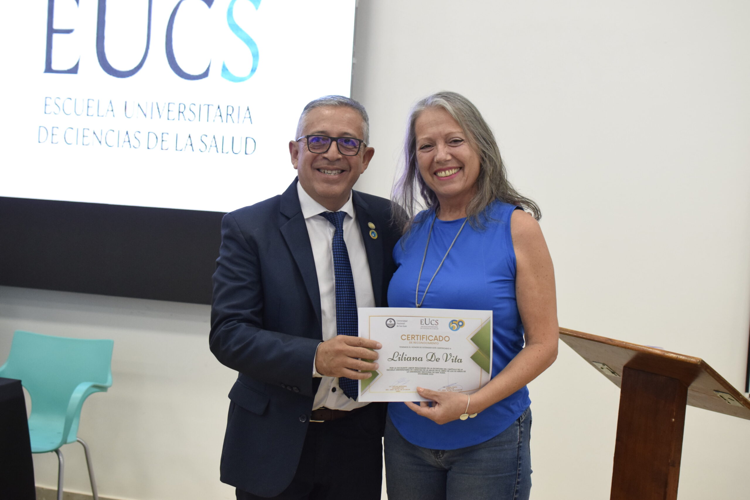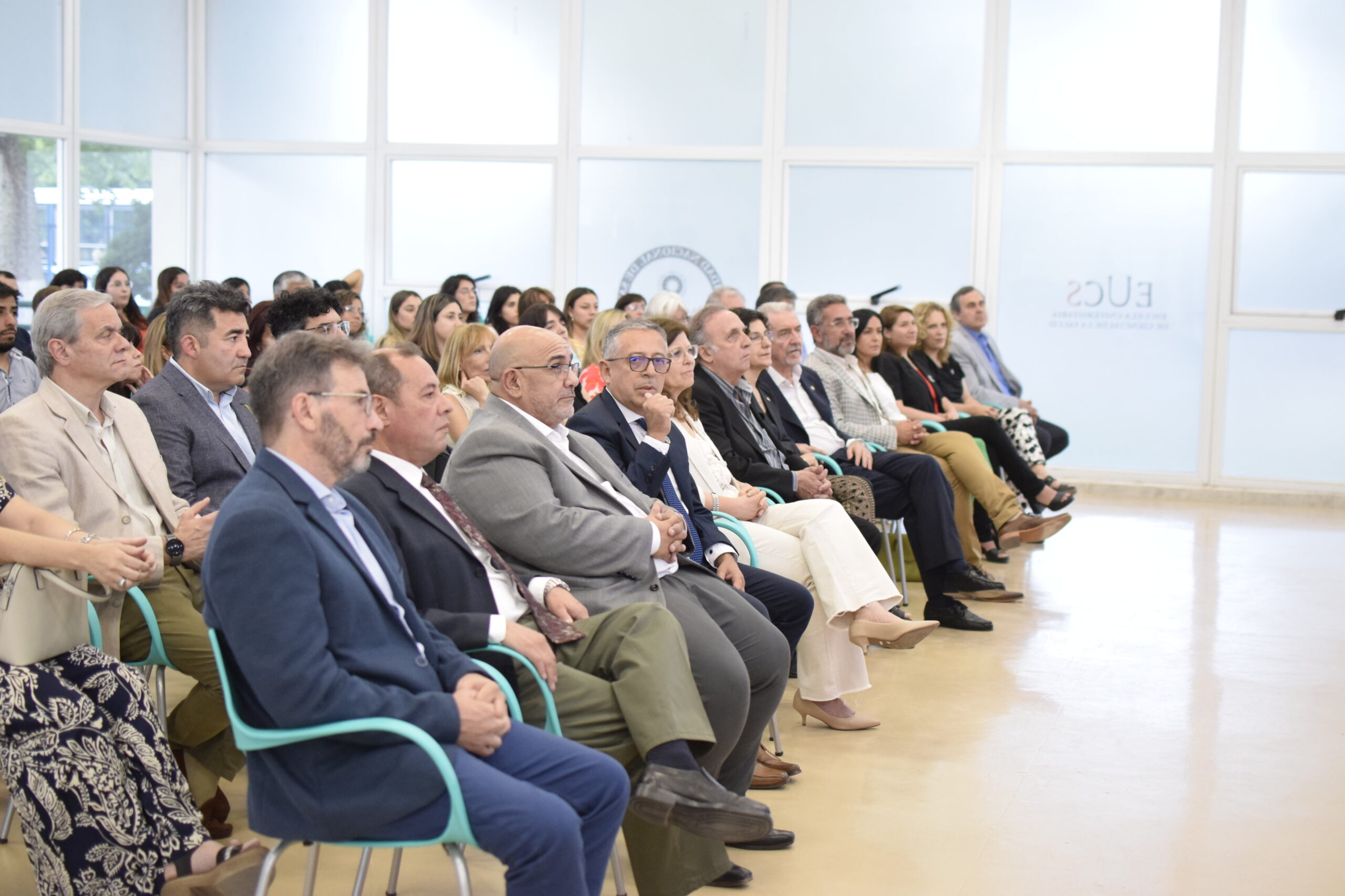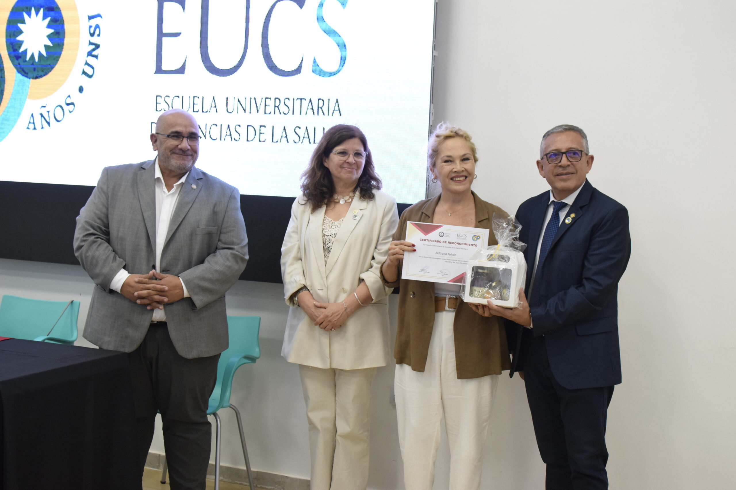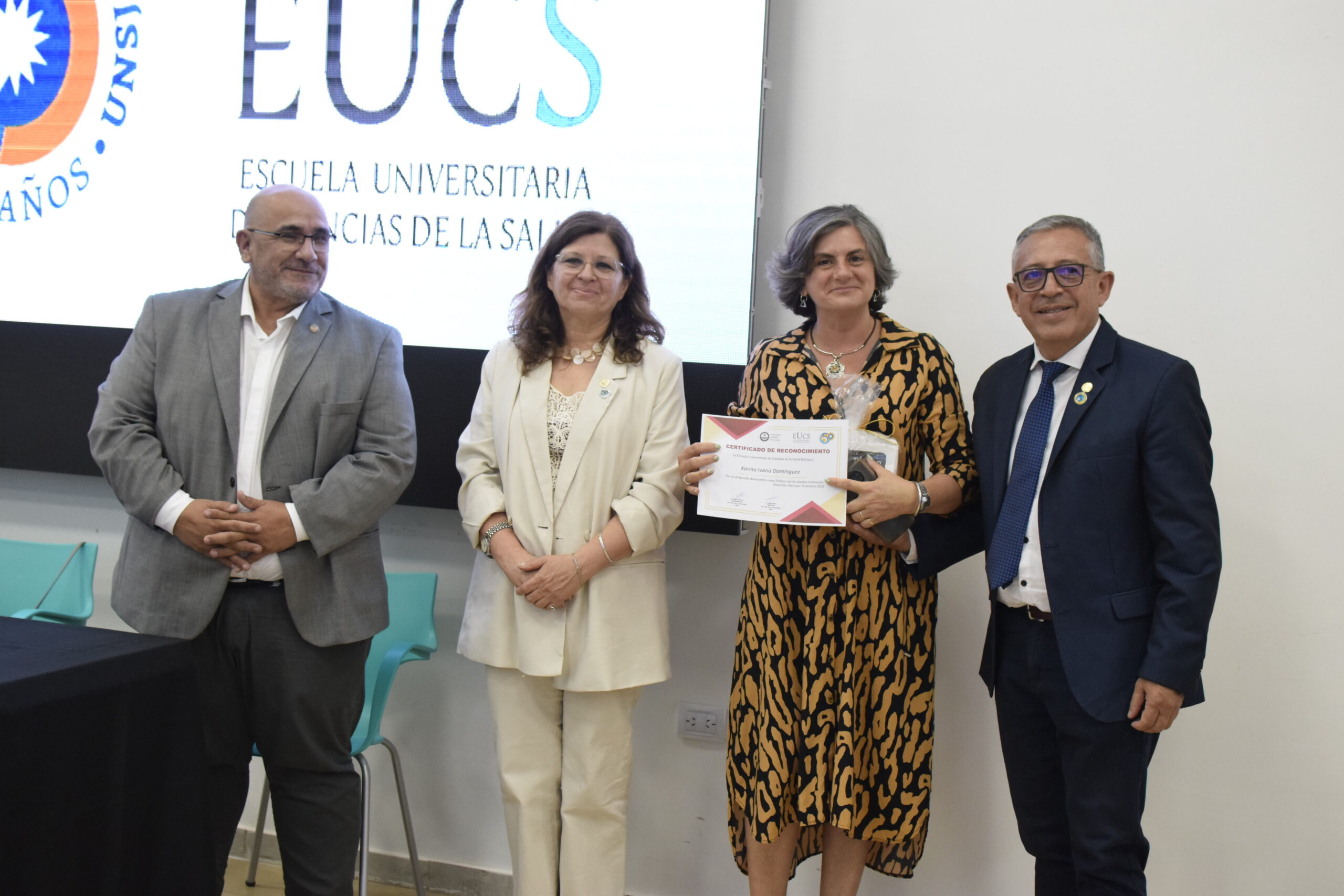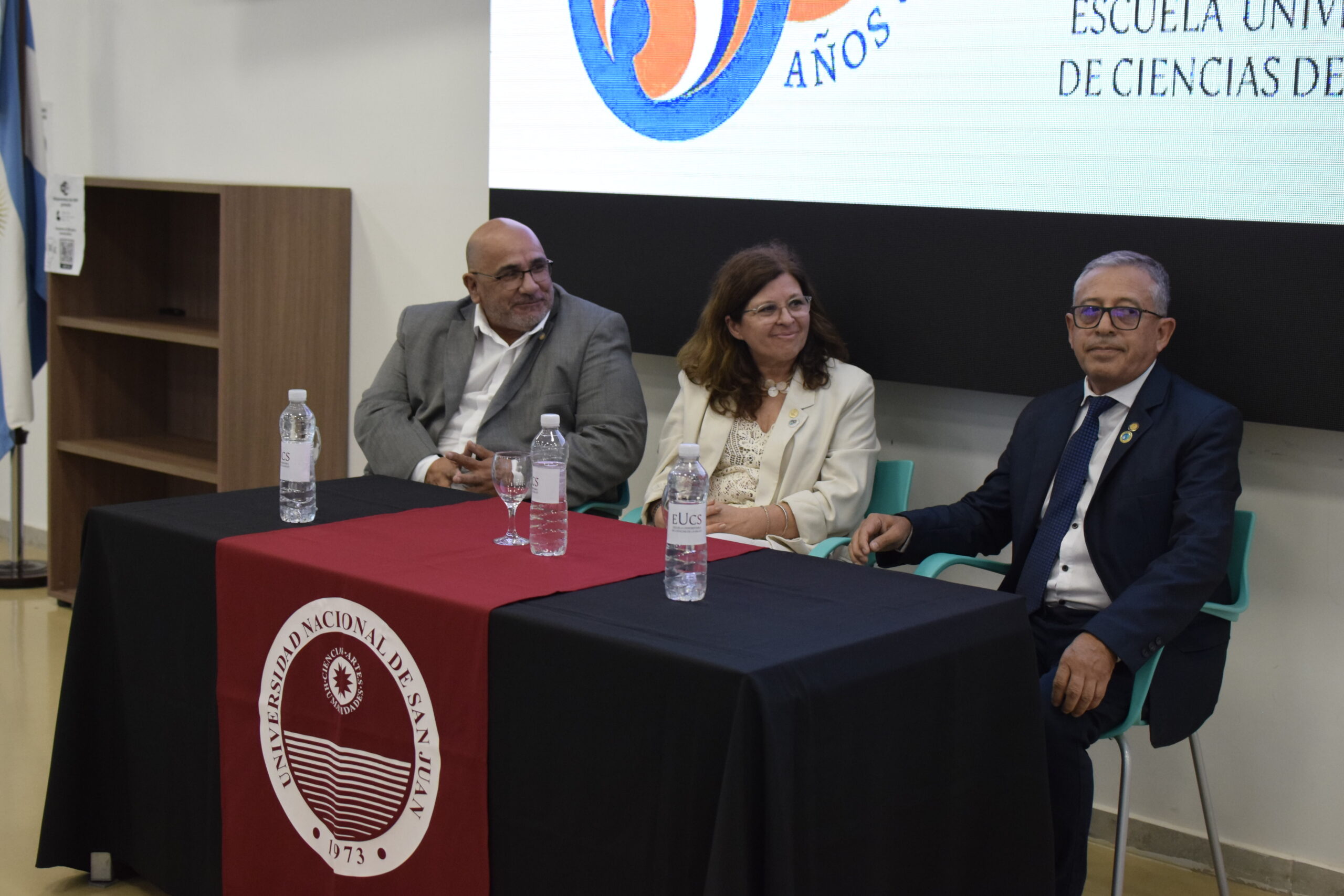 En la tarde del jueves 21 de diciembre se celebró el 7º Aniversario de la Escuela Universitaria de Ciencias de la Salud (EUCS). Al acto asistió la Sra. Vicerrectora de la Universidad Nacional de San Juan (UNSJ), Dra. Analía Ponce y estuvieron presentes autoridades de todas las unidades académicas, entre ellos/as sus anfitriones el Director de la EUCS, Lic. Esp. Ángel Pinto y el Vicedirector, Lic. Esp. Oscar Quintero. Junto a ellos, el Decano de la Facultad de Ciencias Exactas, Físicas y Naturales (FCEFN), Ing. Rodolfo Bloch; el Decano de la Facultad de Arquitectura Urbanismo y Diseño, Arq. Guillermo Velasco; la Decana de la Facultad de Filosofía, Humanidades y Artes, Mag. Myriam Arrabal y la Vicedecana de la Facultad de Ingeniería, Dra. Ing. Andrea Díaz.