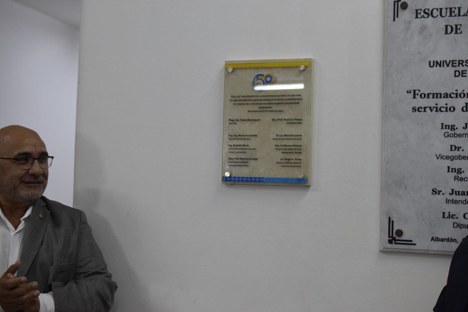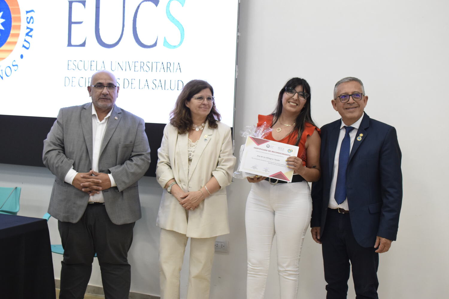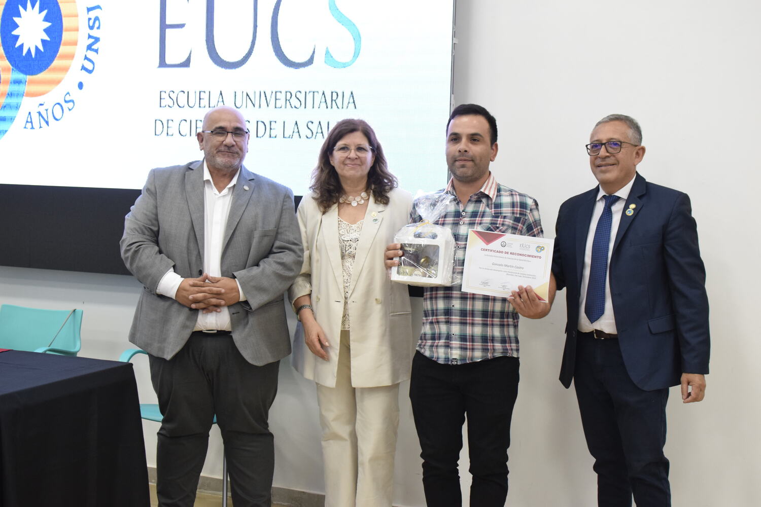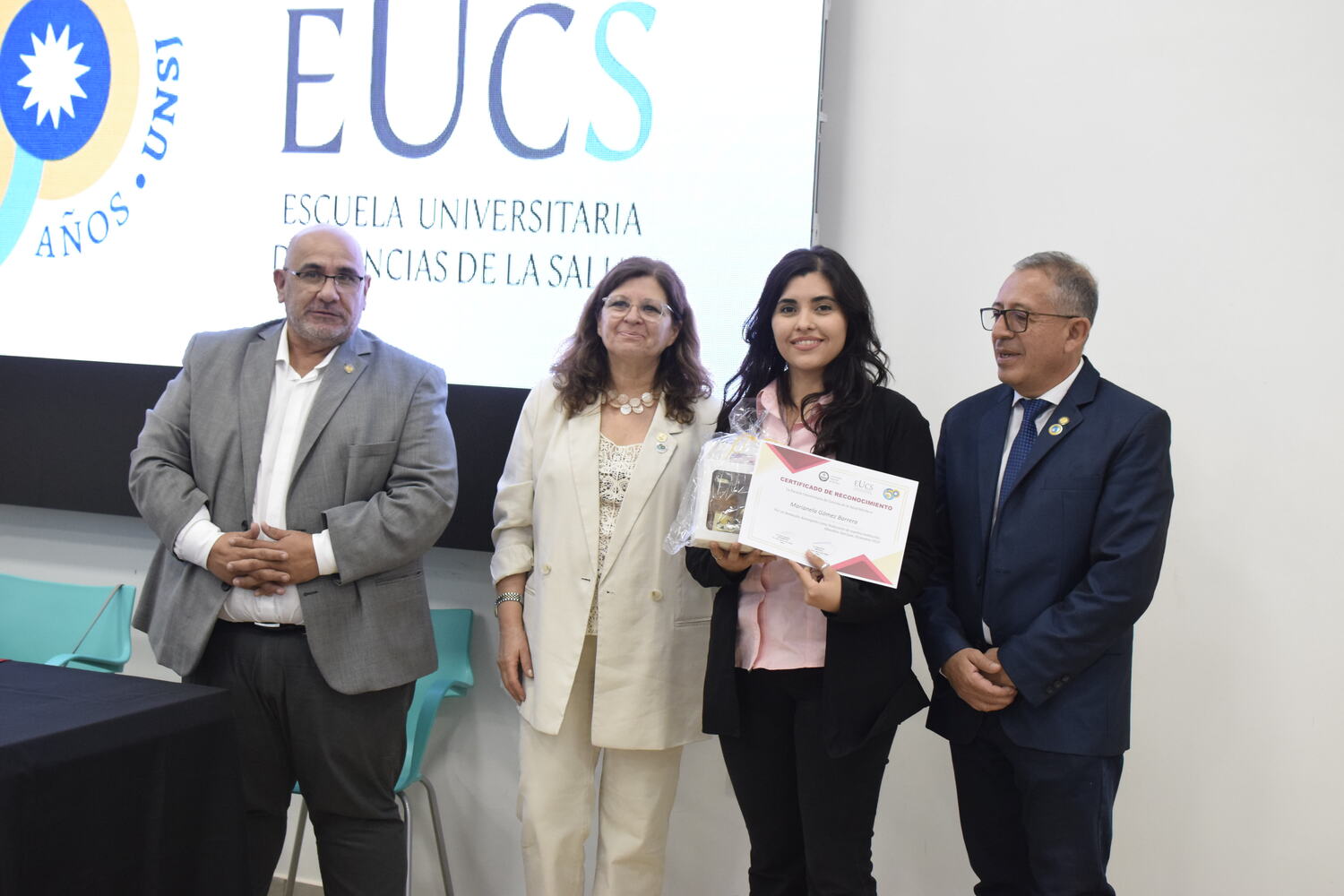 En la tarde del jueves 21 de diciembre se celebró el 7º Aniversario de la Escuela Universitaria de Ciencias de la Salud (EUCS). Al acto asistió la Sra. Vicerrectora de la Universidad Nacional de San Juan (UNSJ), Dra. Analía Ponce y estuvieron presentes autoridades de todas las unidades académicas, entre ellos/as sus anfitriones el Director de la EUCS, Lic. Esp. Ángel Pinto y el Vicedirector, Lic. Esp. Oscar Quintero. Junto a ellos, el Decano de la Facultad de Ciencias Exactas, Físicas y Naturales (FCEFN), Ing. Rodolfo Bloch; el Decano de la Facultad de Arquitectura Urbanismo y Diseño, Arq. Guillermo Velasco; la Decana de la Facultad de Filosofía, Humanidades y Artes, Mag. Myriam Arrabal y la Vicedecana de la Facultad de Ingeniería, Dra. Ing. Andrea Díaz.