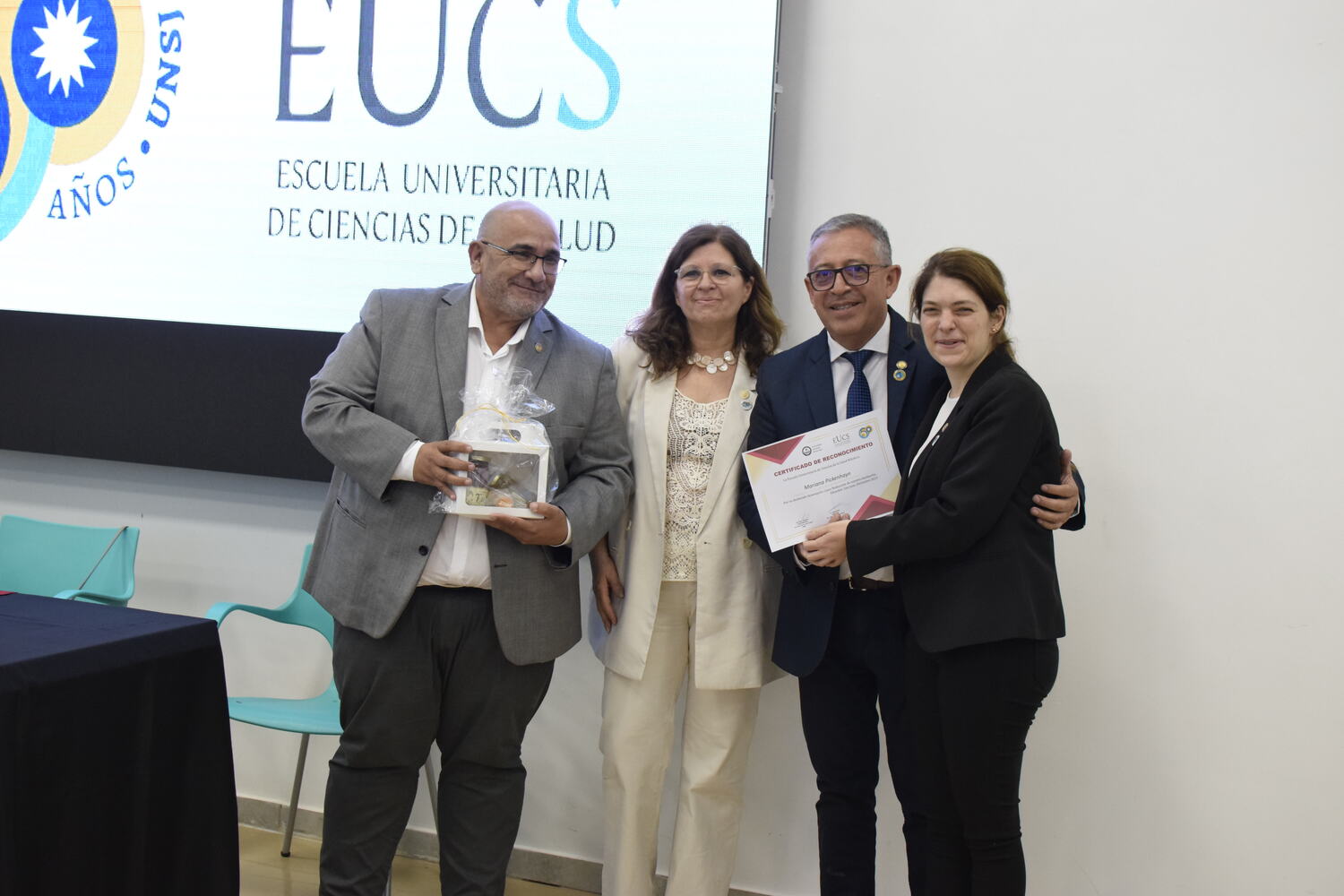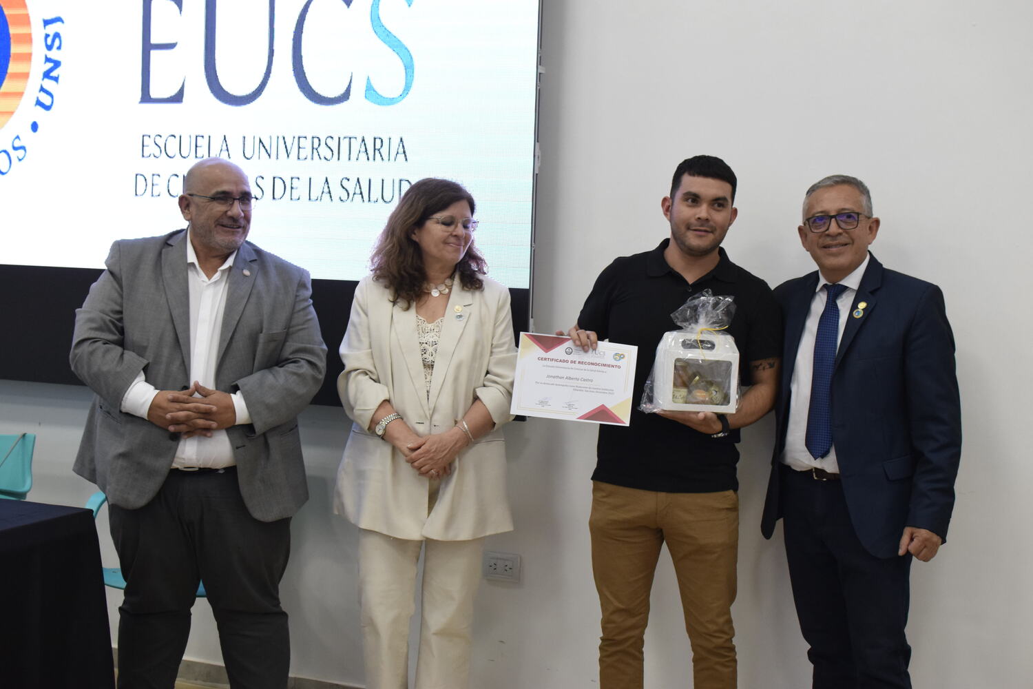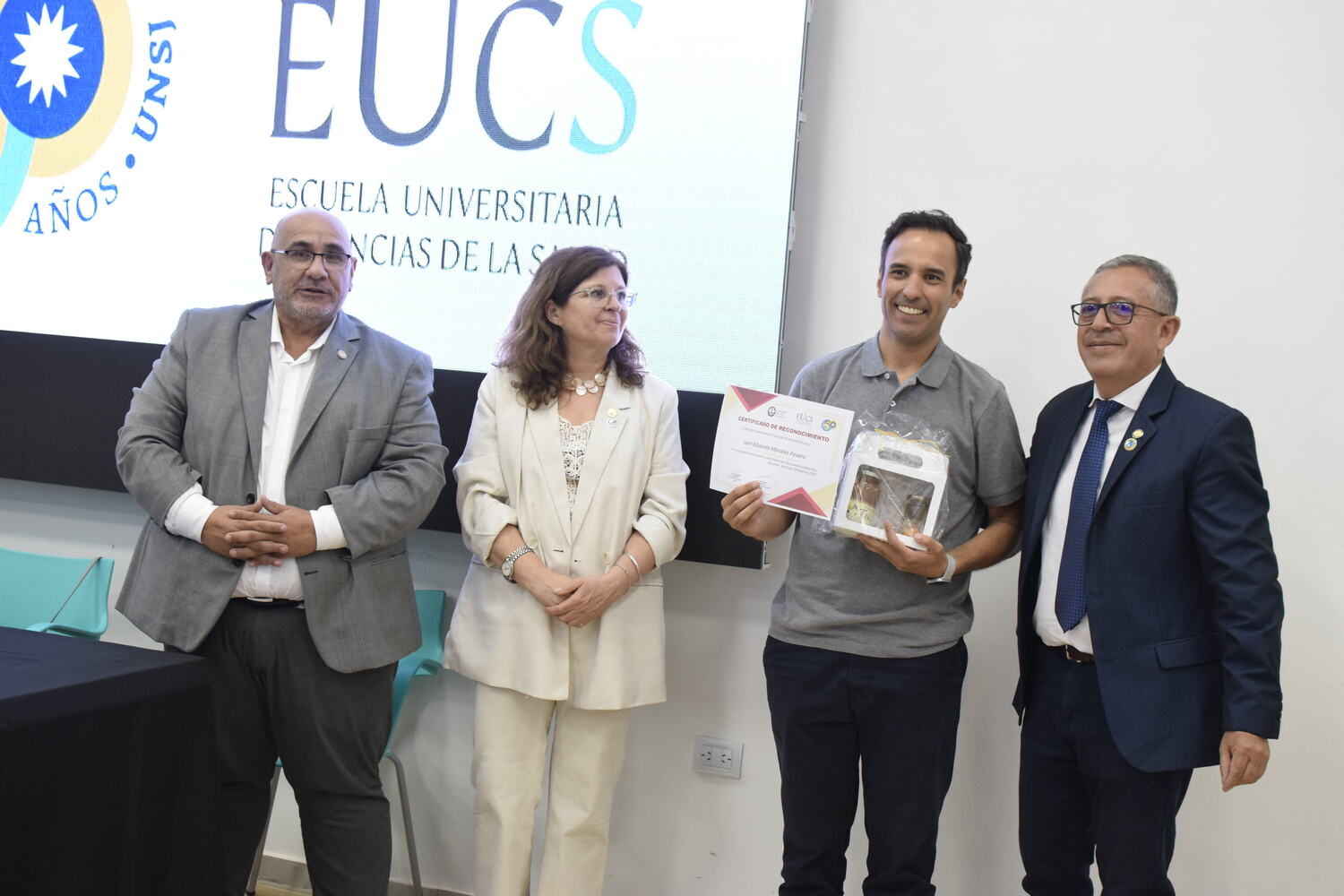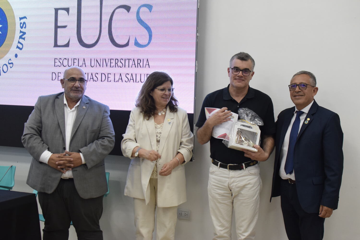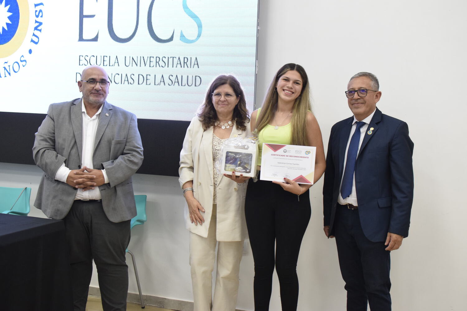 En la tarde del jueves 21 de diciembre se celebró el 7º Aniversario de la Escuela Universitaria de Ciencias de la Salud (EUCS). Al acto asistió la Sra. Vicerrectora de la Universidad Nacional de San Juan (UNSJ), Dra. Analía Ponce y estuvieron presentes autoridades de todas las unidades académicas, entre ellos/as sus anfitriones el Director de la EUCS, Lic. Esp. Ángel Pinto y el Vicedirector, Lic. Esp. Oscar Quintero. Junto a ellos, el Decano de la Facultad de Ciencias Exactas, Físicas y Naturales (FCEFN), Ing. Rodolfo Bloch; el Decano de la Facultad de Arquitectura Urbanismo y Diseño, Arq. Guillermo Velasco; la Decana de la Facultad de Filosofía, Humanidades y Artes, Mag. Myriam Arrabal y la Vicedecana de la Facultad de Ingeniería, Dra. Ing. Andrea Díaz.