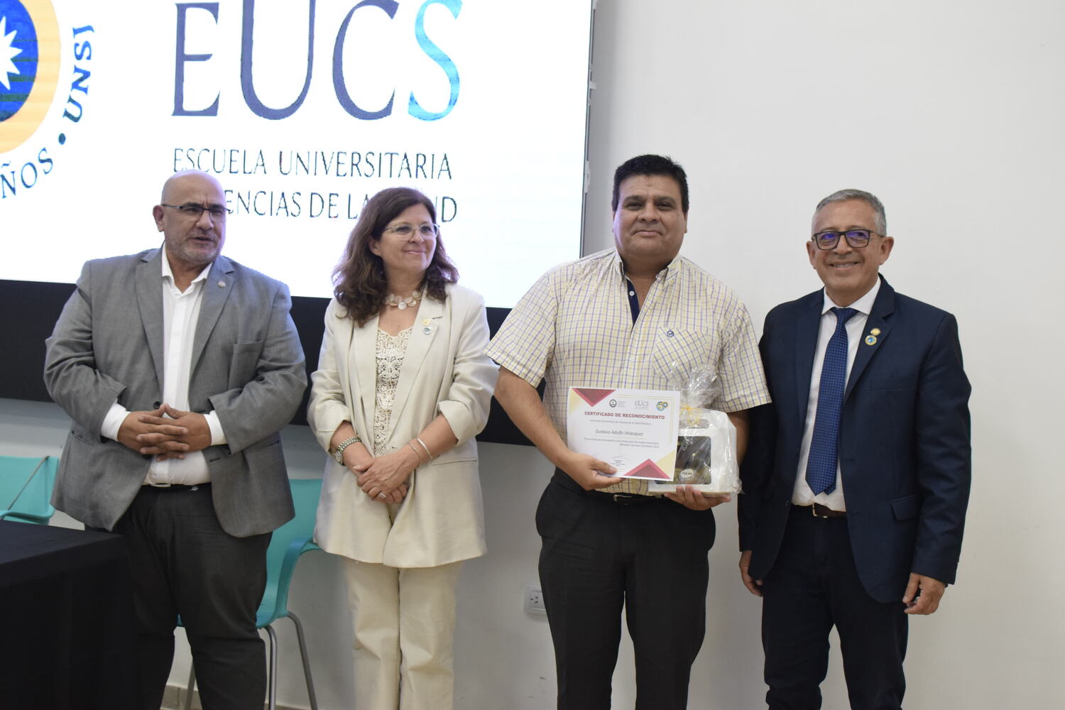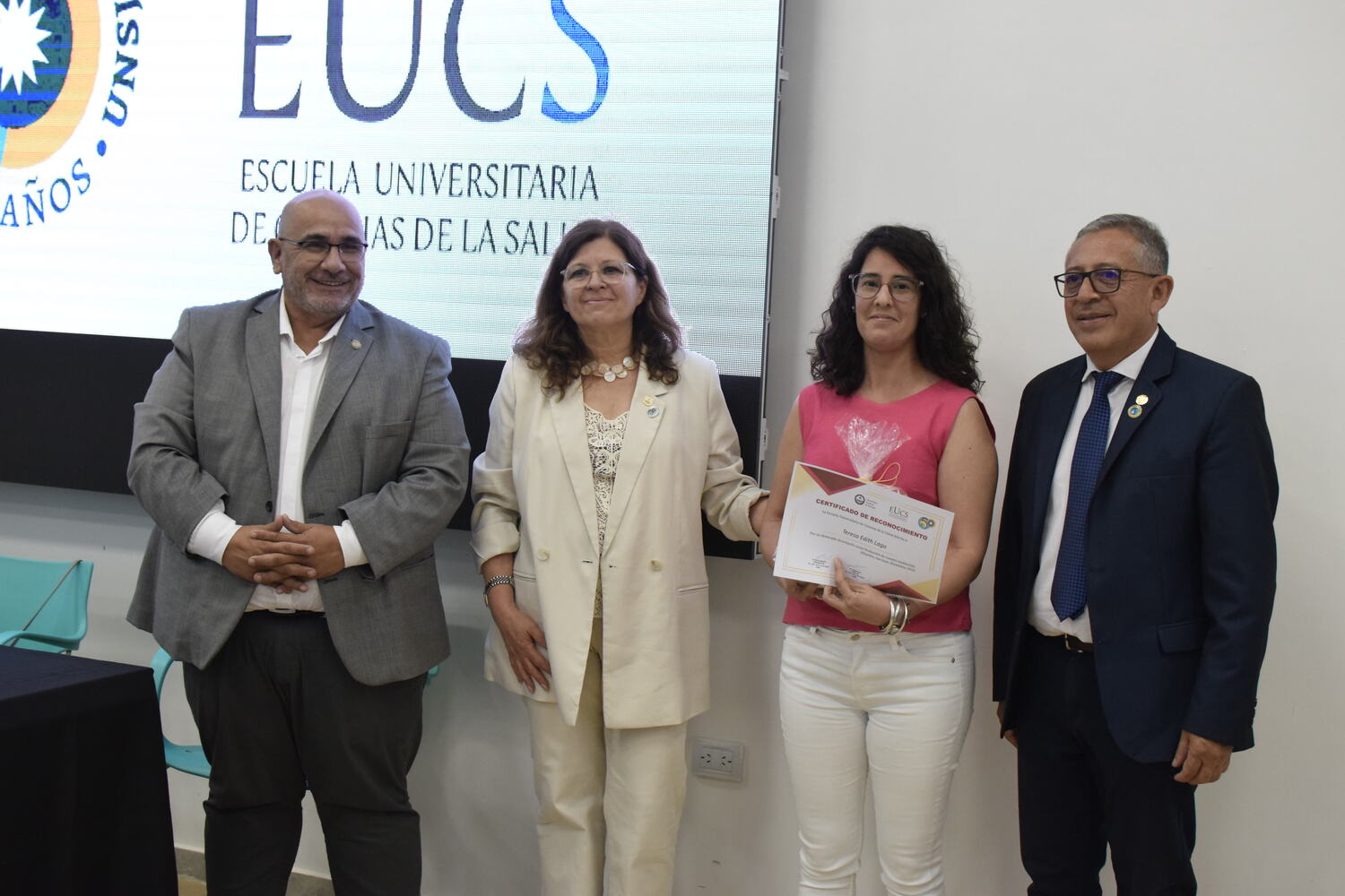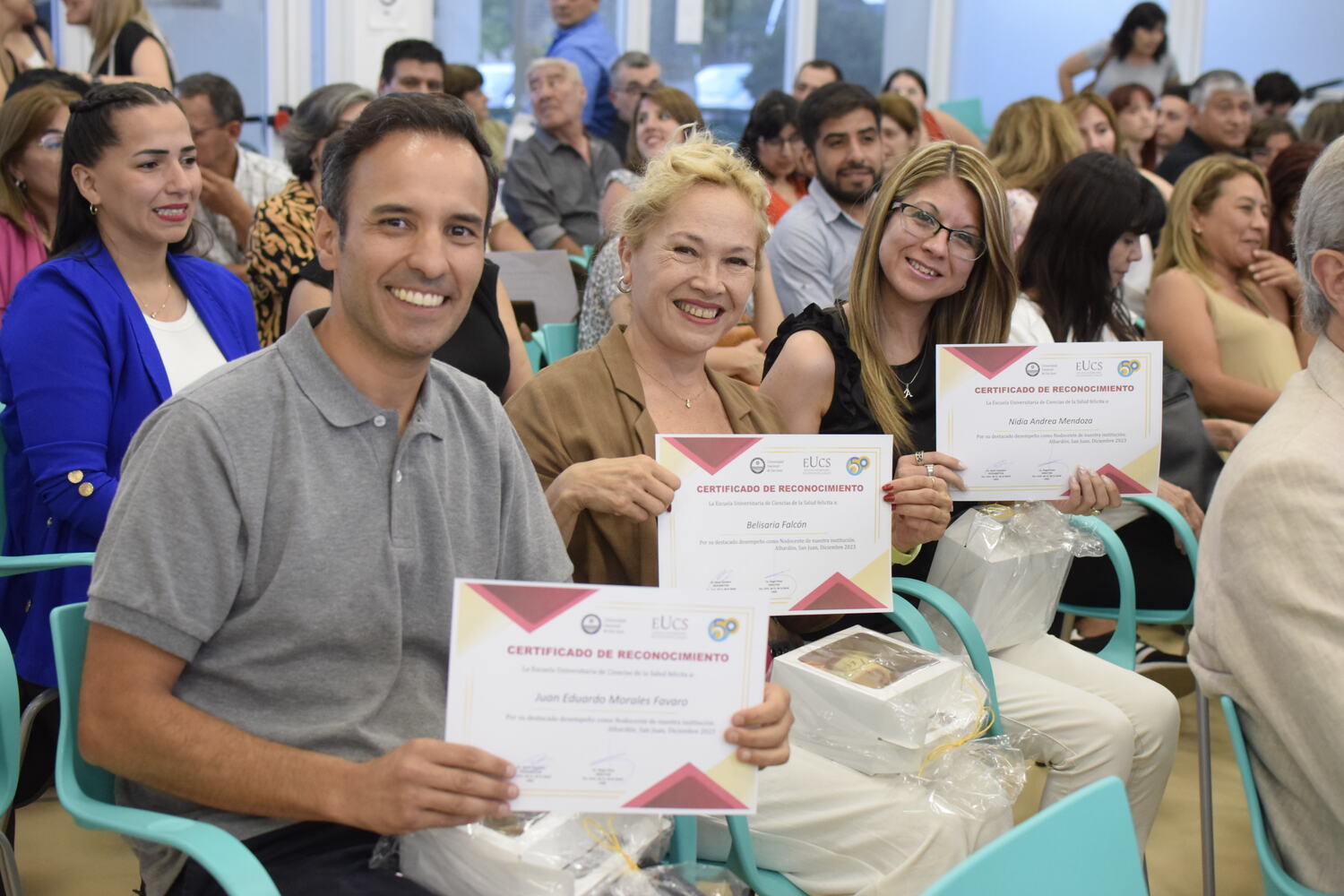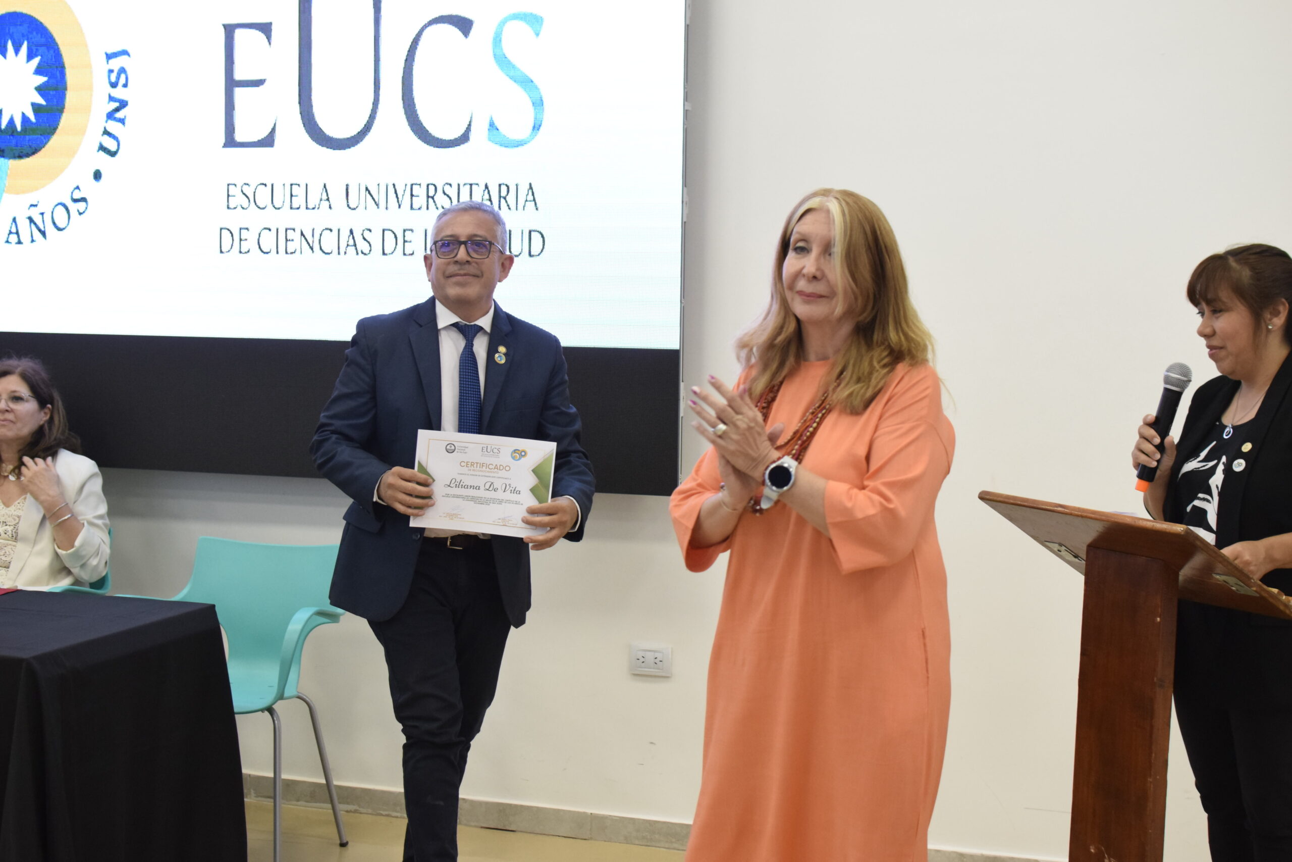 En la tarde del jueves 21 de diciembre se celebró el 7º Aniversario de la Escuela Universitaria de Ciencias de la Salud (EUCS). Al acto asistió la Sra. Vicerrectora de la Universidad Nacional de San Juan (UNSJ), Dra. Analía Ponce y estuvieron presentes autoridades de todas las unidades académicas, entre ellos/as sus anfitriones el Director de la EUCS, Lic. Esp. Ángel Pinto y el Vicedirector, Lic. Esp. Oscar Quintero. Junto a ellos, el Decano de la Facultad de Ciencias Exactas, Físicas y Naturales (FCEFN), Ing. Rodolfo Bloch; el Decano de la Facultad de Arquitectura Urbanismo y Diseño, Arq. Guillermo Velasco; la Decana de la Facultad de Filosofía, Humanidades y Artes, Mag. Myriam Arrabal y la Vicedecana de la Facultad de Ingeniería, Dra. Ing. Andrea Díaz.