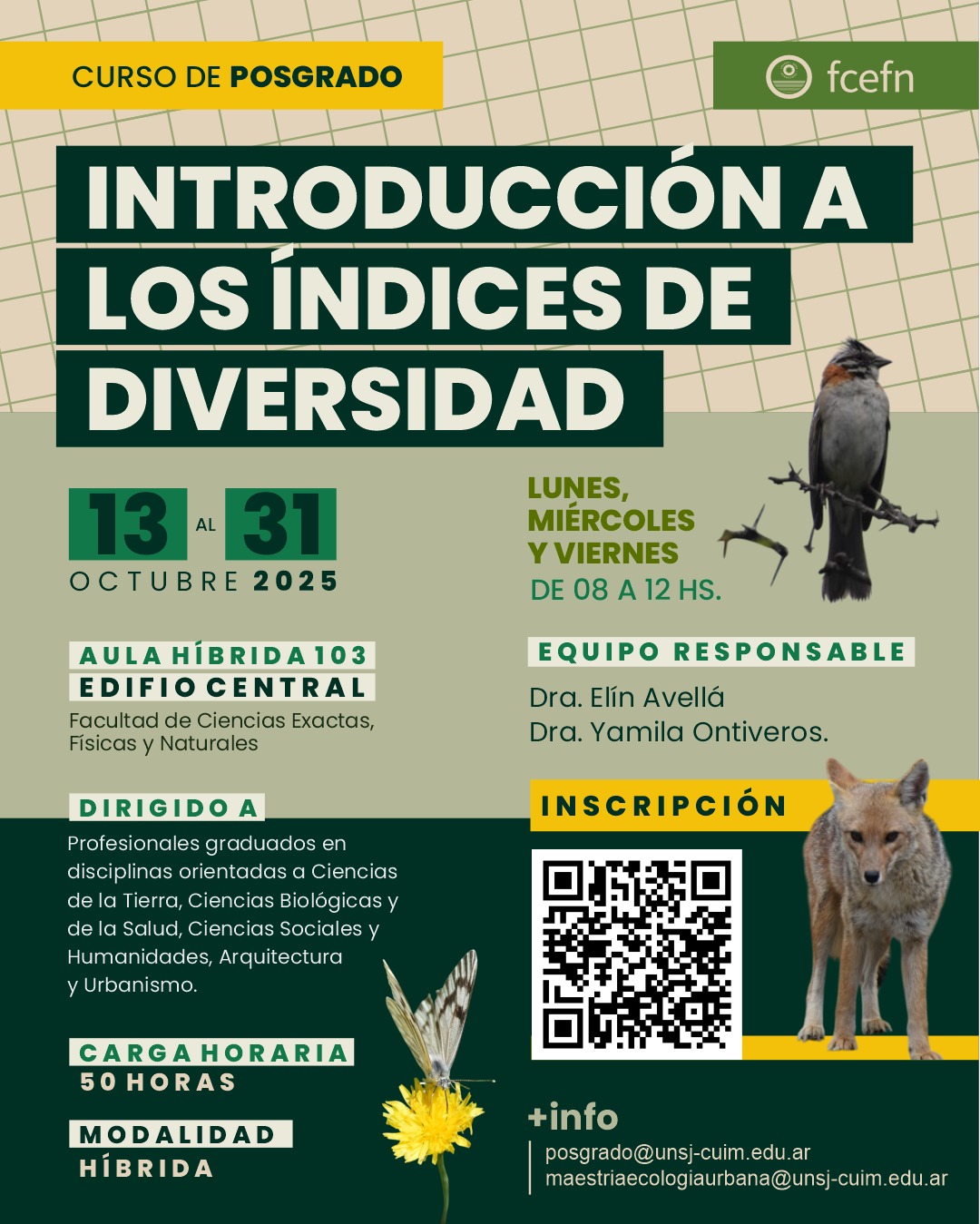 La Facultad de Ciencias Exactas, Físicas y Naturales (FCEFN) de la UNSJ informa que se encuentra abierta la inscripción para el Curso de Posgrado “Introducción a los Índices de Diversidad”, destinado a profesionales interesados en el estudio, control y manejo de especies que afectan la salud en entornos urbanos.